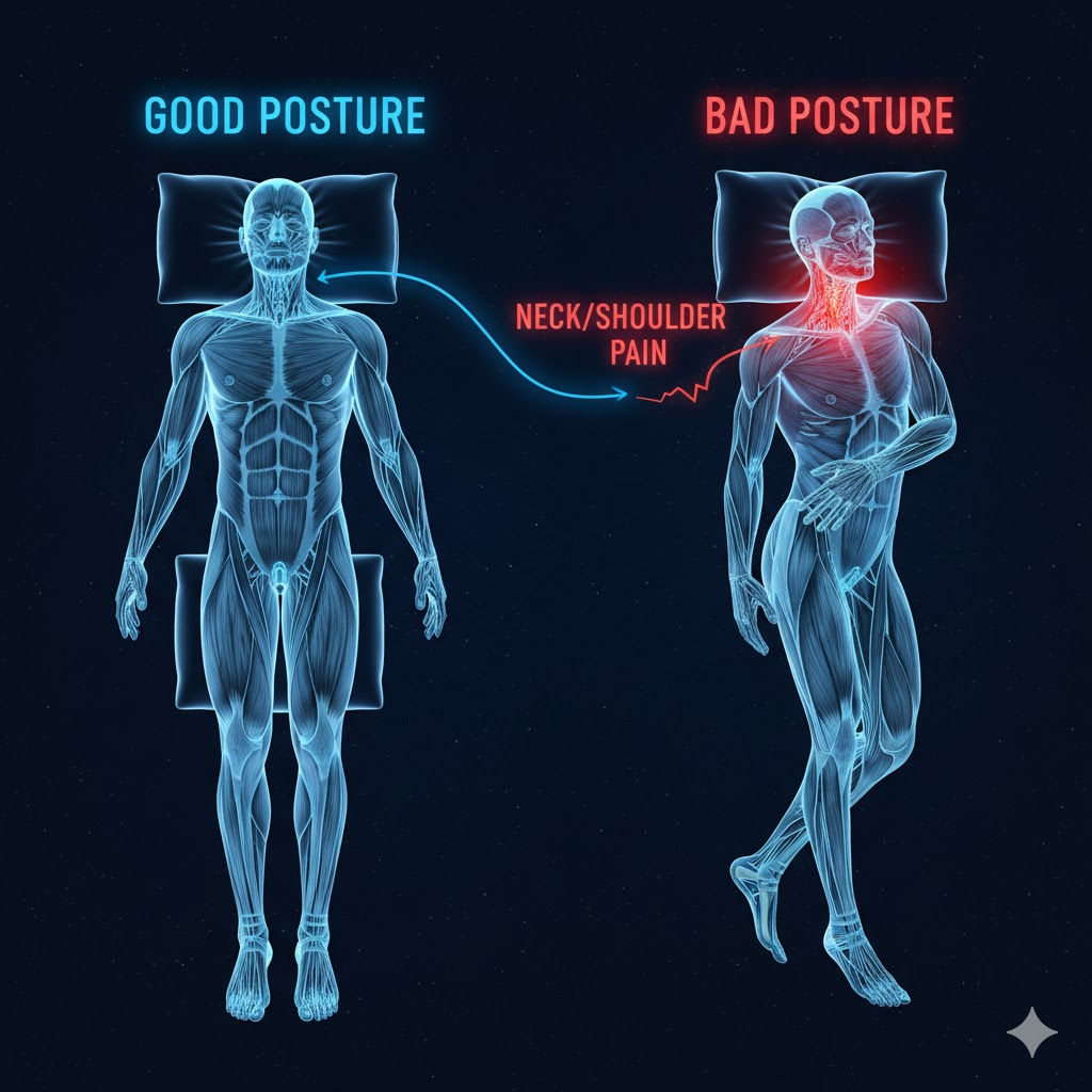 Sleep posture is like a silent influencer, it shapes how you move even when you’re awake. Poor sleep positions gradually train your muscles and joints into unhealthy alignments, affecting everything from how you stand in line at the coffee shop to how you sit at your desk. - Neck Strain & Headaches